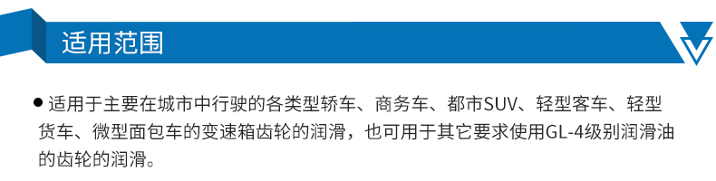 ●適用于主要在城市中行駛的各類(lèi)型轎車(chē)、商務(wù)車(chē)、都市SUV、輕型客車(chē)、輕型貨車(chē)、微型面包車(chē)的變速箱齒輪的潤(rùn)滑,也可用于其它要求使用GL-4級(jí)別潤(rùn)滑油的齒輪的潤(rùn)滑。